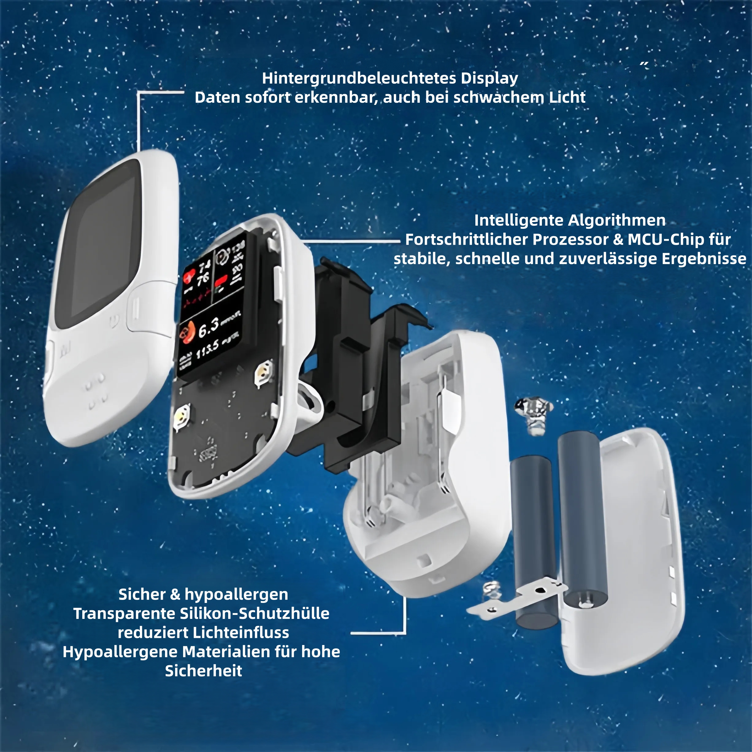 Dank Photon-Chip-Technologie und optischem Absorptionsspektrum-Messverfahren liefert das Gerät extrem präzise Blutzuckerwerte.